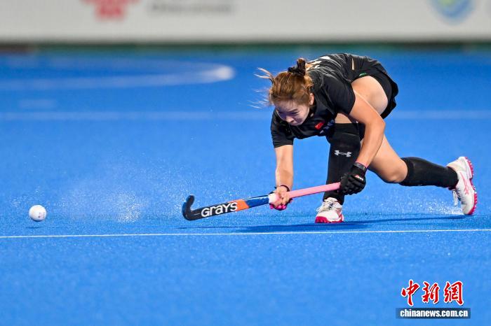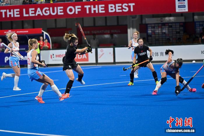 2月5日晚,FIH女子曲棍球世界超级联赛第七赛季(中国站)赛事在广东云浮开赛。首场比赛中,中国队(黑衣)0比3不敌荷兰队(白衣)。图为中国队刘晨诚在比赛中进攻。中新社记者 陈骥旻 摄