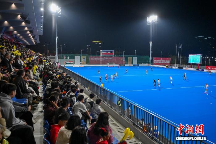 2月5日晚,FIH女子曲棍球世界超级联赛第七赛季(中国站)赛事在广东云浮开赛。首场比赛中,中国队(黑衣)0比3不敌荷兰队(白衣)。图为市民现场观赛。中新社记者 陈骥旻 摄