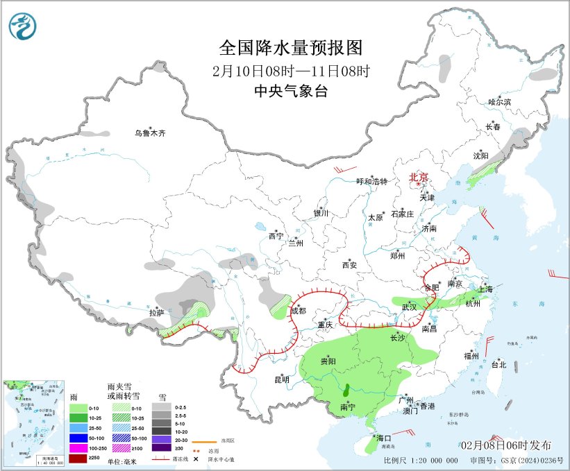 2月8日08时至9日08时,新疆北部、西藏东部、青海南部、甘肃南部、陕西中南部、川西高原北部等地部分地区有小雪或雨夹雪,其中,新疆伊犁河谷、西藏东北部等地部分地区有中到大雪(5~8毫米);西藏东南部、四川中东部、云南东部、重庆、贵州、湖南、广西西部、海南岛、台湾岛东部等地部分地区有小到中雨。新疆北疆东部和南疆盆地南部、西藏北部、内蒙古中西部、青海西部等地部分地区有5~6级风,阵风7~8级;黄海、东海、台湾海峡、巴士海峡、台湾以东洋面、南海等海域有6~9级风、阵风9~10级。