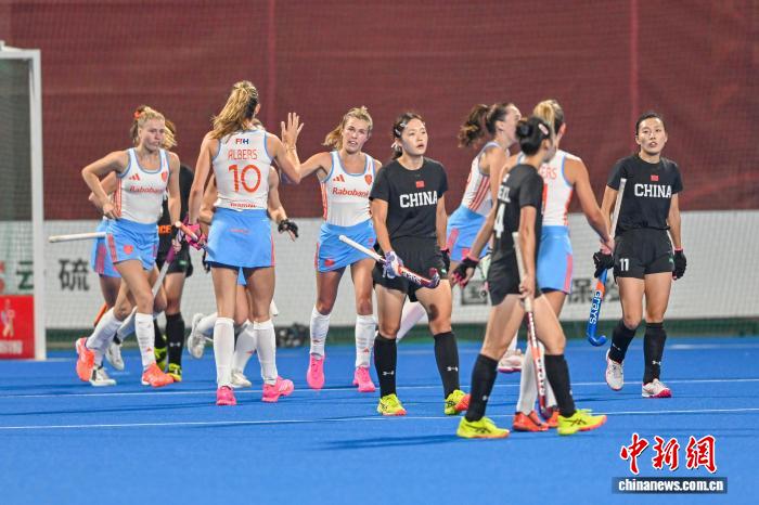 2月5日晚,FIH女子曲棍球世界超级联赛第七赛季(中国站)赛事在广东云浮开赛。首场比赛中,中国队(黑衣)0比3不敌荷兰队(白衣)。图为荷兰队进球后庆祝。中新社记者 陈骥旻 摄
