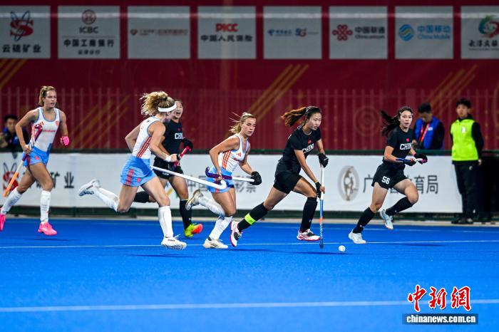 2月5日晚,FIH女子曲棍球世界超级联赛第七赛季(中国站)赛事在广东云浮开赛。首场比赛中,中国队(黑衣)0比3不敌荷兰队(白衣)。图为比赛现场。中新社记者 陈骥旻 摄