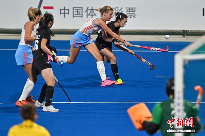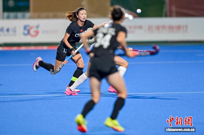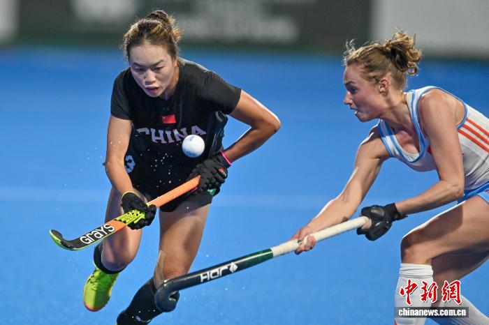 2月5日晚,FIH女子曲棍球世界超级联赛第七赛季(中国站)赛事在广东云浮开赛。首场比赛中,中国队(黑衣)0比3不敌荷兰队(白衣)。图为中国队刘晨诚在比赛中进攻。中新社记者 陈骥旻 摄